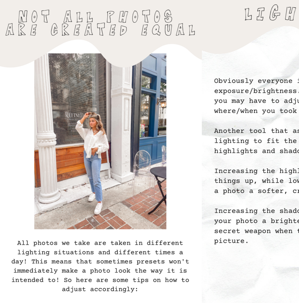 I've used countless editing apps that require a monthly subscription. The subscriptions end up costing way more than the cost of one preset pack! These presets are what I use to create a more cohesive feed that brighten up any picture! These are intended to be used on photos taken on your phone. Included is a how to download guide + an in depth editing guide to make sure the presets suit your photo best! This editing guide will also give you tips on editing your own photos without using a preset or an editing app!